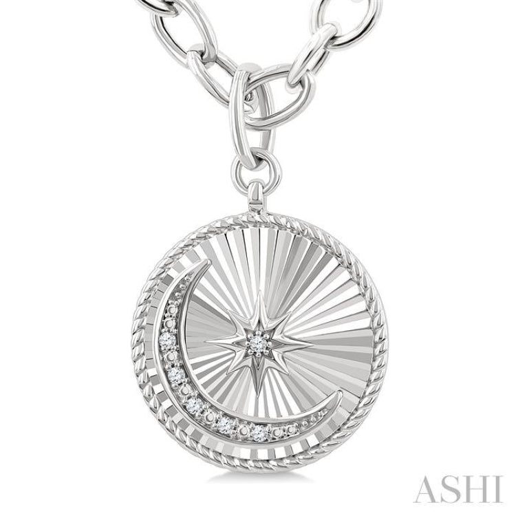 1/20 Ctw Circle Fluted Medallion Single Cut Diamond Moon & Star Fashion Pendant With Chain in Sterling Silver