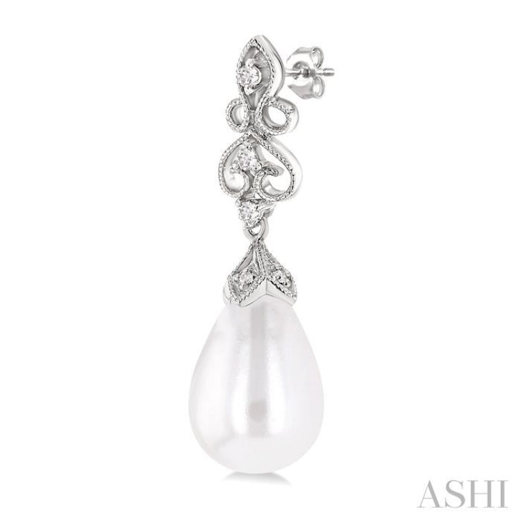 A captivating fusion of classic elegance and modern design, these pearl and diamond fashion earrings embody a perfect balance of delicate style and enamouring sophistication. Each earring showcases an 8X6MM teardrop shaped white pearl that gracefully dangles from an open cutwork frame, offering a look that is both refined and alluring. The intricate frame is adorned with 3 prong hand set round cut diamonds, while four kite-shaped attachments, designed to hold the teardrop pearl, are accentuated by 4 prong hand set round cut diamonds. Secure push-back earnut clasps ensure ease-of-wear. The fashion earrings are crafted in a rhodium finish 10 karat white gold. Total diamond weight is 1/20 ctw.