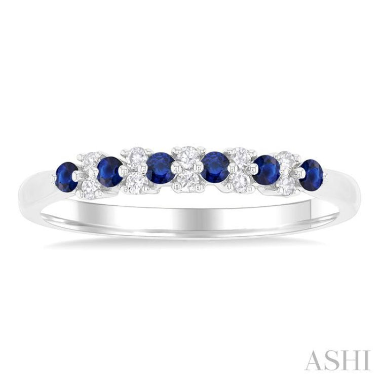 A beautiful precious gemstone band, this appeals to the eye instantly. It is stylish and elegant and a must-have addition to one's jewelry box. The band features a lovely layout of sapphires and diamonds along the ring top. There are 6 round cut 1.9 MM sapphires, with 2 each, total 10, prong set round cut diamonds lying vertically between the sapphires, embellishing the top. The precious gemstone sapphire and diamond band is crafted in a polished rhodium finish 14 karat white gold. Total diamond weight is 1/10 Ctw.