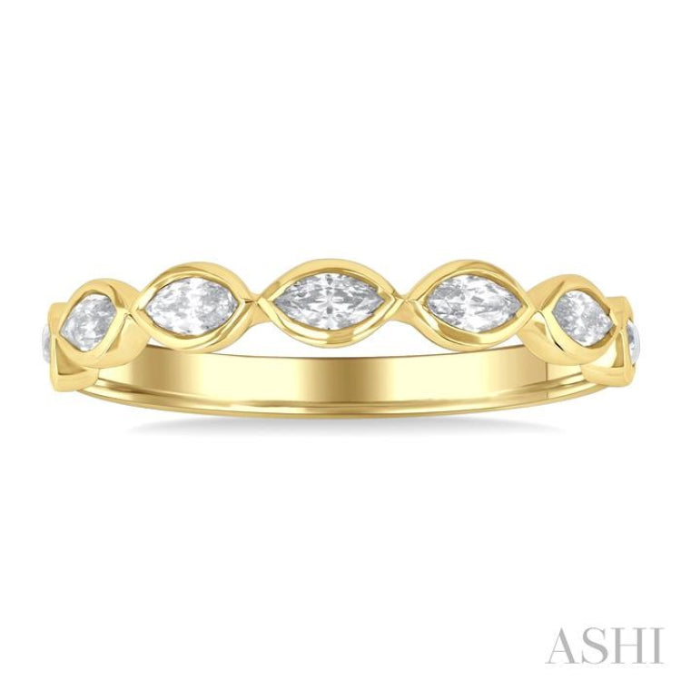 An attractive stackable diamond fashion band, this makes a fine addition to one's collection. It can be mixed and matched with different stack bands for a new look every time. The stackable band features a straight row of seven marquise mounts, inlaid with east-west set marquise cut diamonds. There are 7 bezel set 1/10 Ctw marquise cut diamonds embellishing the marquise mounts. The stackable bezel diamond fashion band is sculpted in 14 karat yellow gold. The total diamond weight is 3/4 Ctw.