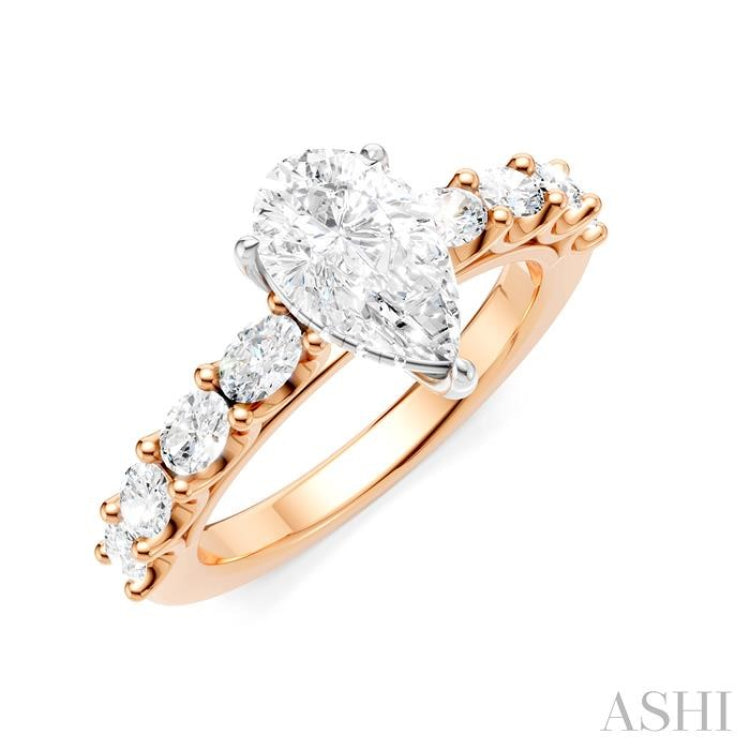 Celebrate your love story with this exquisite and meaningful Semi-Mount diamond engagement ring, destined to be treasured for a lifetime. Skillfully crafted with attention to detail, the ring features at its center, a 14 karat white gold prong-raised pear-shaped mount designed to hold a center stone of your choice. This must be an pear cut diamond in the range of .85 Ctw to 1.20 Ctw. Complementing the center mount are pre-adorned 4 each fancy prong set 1/10 Ctw oval cut diamonds on either side of the shank, adding a touch of glamour and refinement to the ring. Enhancing the gallery region are 10 microscopic split prong set round cut diamonds. The Semi-Mount engagement ring is fashioned in a rhodium finish 14 karat rose and white gold. The total diamond weight is 7/8 Ctw.